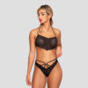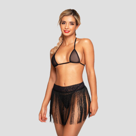 Conjunto en delicada mallatex negra. Incluye top y panty en mesh y falda flecos con cintura de graduar en encaje. Industria 100% Colombiana.